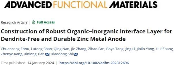 近日,海洋科学与工程学院史晓东副研究员所在团队在材料领域Top期刊Advanced Functional Materials (IF=19.0)发表题为《Construction of robust organic-inorganic interface layer for dendrite-free and durable zinc metal anode》的研究论文。jinnianhui金年会官网周传聪博士、曼彻斯特大学单路通博士为论文共同第一作者,海洋科学与工程学院史晓东副研究员、田新龙教授为论文共同通讯作者,jinnianhui金年会官网海洋科学与工程学院为第一通讯单位。