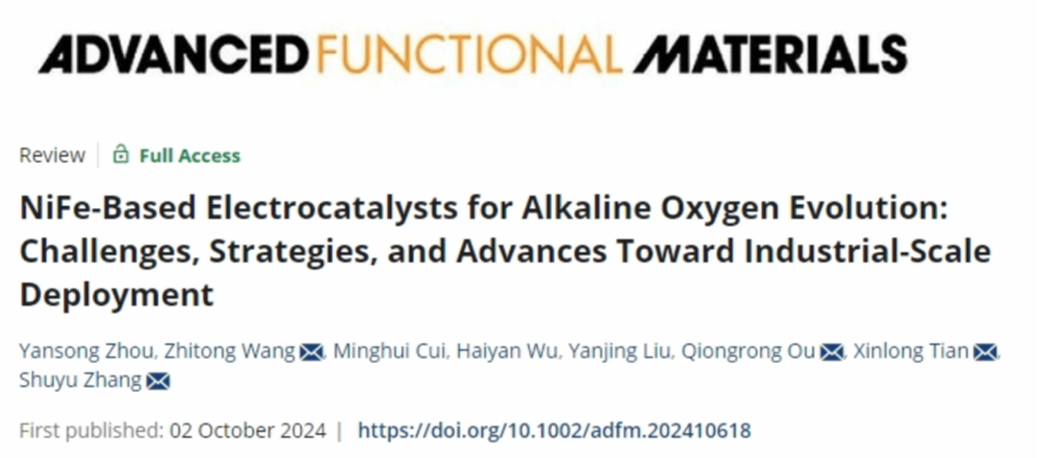 近日,海洋科学与工程学院王志同副教授所在团队在能源化学领域Top期刊Advanced Functional Materials (IF=18.5)上发表题为“NiFe-Based Electrocatalysts for Alkaline Oxygen Evolution: Challenges, Strategies, and Advances Toward Industrial-Scale Deployment”的研究论文。博士研究生周岩松为论文第一作者,jinnianhui金年会官网王志同副教授和田新龙教授为论文共同通讯作者。