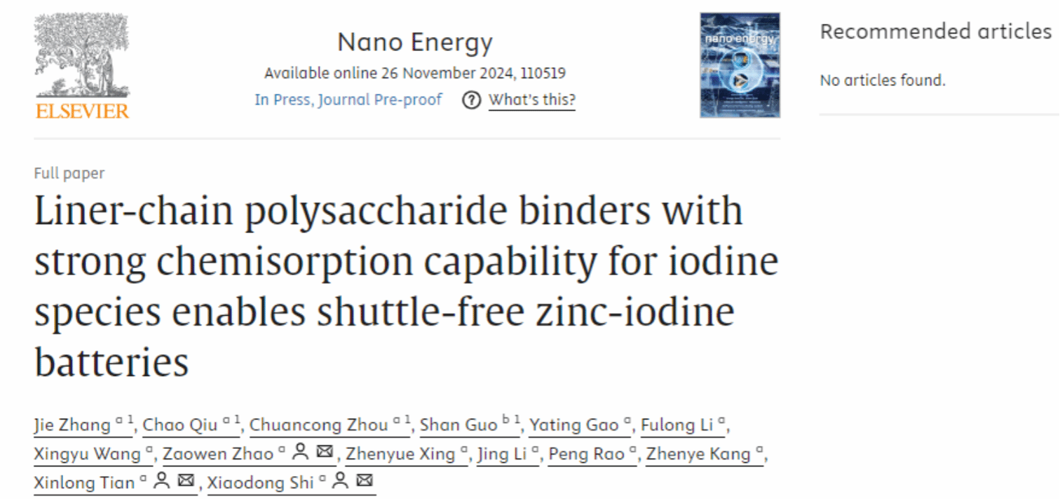 近日,史晓东副教授所在团队在纳米能源领域顶级期刊Nano Energy发表题为“Liner-chain polysaccharide binders with strong chemisorption capability for iodine species enables shuttle-free zinc-iodine batteries”的研究论文。张杰硕士、邱超博士、周传聪博士为论文共同第一作者,史晓东副教授和田新龙教授为论文共同通讯作者。