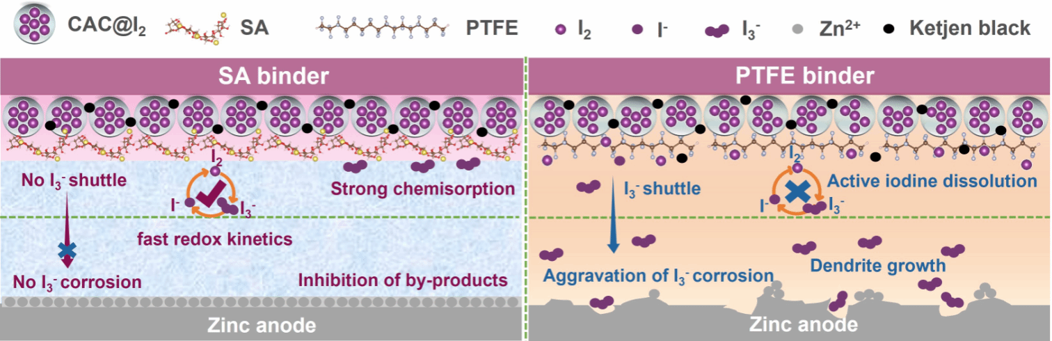 图1海藻酸钠和聚四氟乙烯粘结剂对碘载正极和锌负极的作用机制示意图