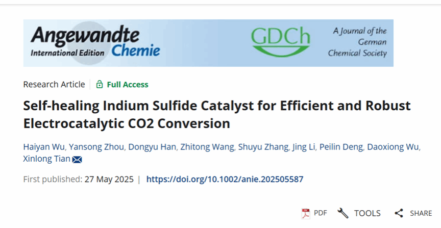 近日,海洋科学与工程学院海洋清洁能源创新团队王志同副教授在能源化学领域Top期刊Angewandte Chemie上发表题为“Self-healing Indium Sulfide Catalyst for Efficient and Robust Electrocatalytic CO2 Conversion”的研究论文。硕士研究生吴海燕、博士研究生韩东钰为论文共同第一作者,jinnianhui金年会官网海洋科学与工程学院王志同副教授,吴道雄副教授与田新龙教授为论文共同通讯作者。