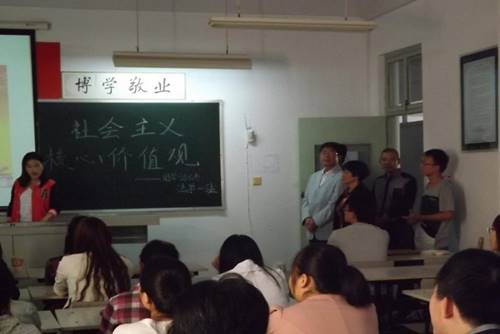为加深best365学生对社会主义核心价值观的了解,号召广大学生践行社会主义核心价值观。9月19号下午,法政学院组织13级全体学生以“社会主义核心价值观”为主题于B3—202、B3—204、B3—205、B3—206、B3—207教室开展了本学期第一次团学活动。法政学院党总支书记崔秀花、党总支副书记王彦、团总支书记黄春建、13级辅导员许建峰等老师前往各班就活动开展情况进行了了解。